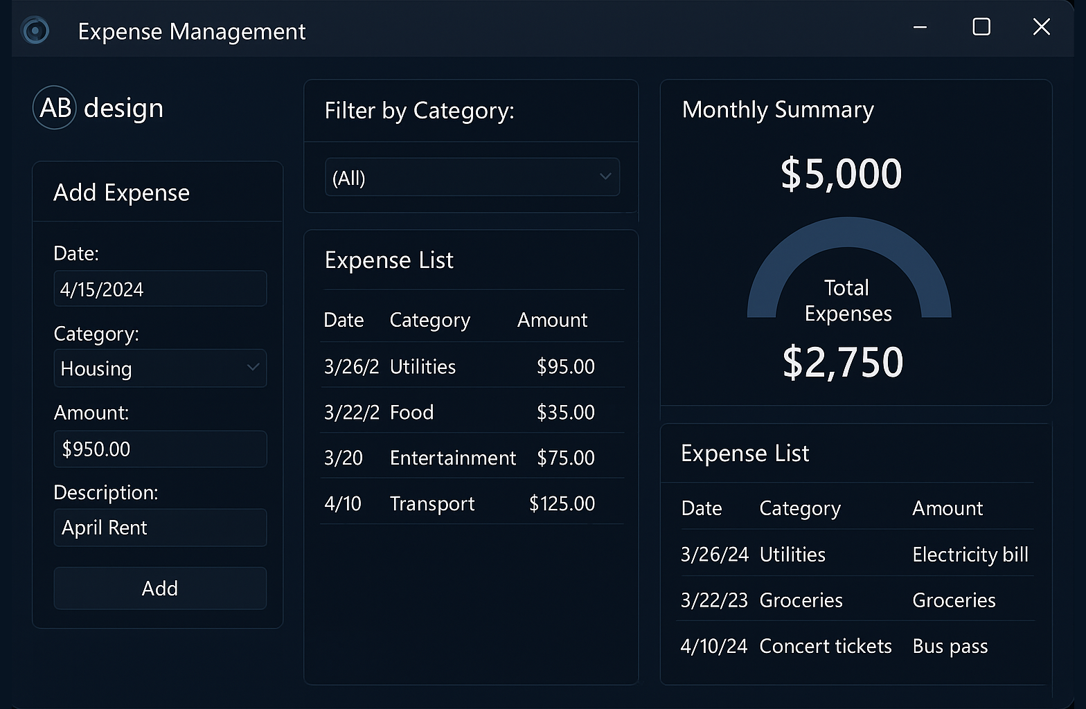 As the final project of the C# and .NET Masterclass, I developed a desktop application for managing personal and household expenses. The application was built using C# within the .NET framework and featured a user-friendly interface for tracking income, categorizing expenses, and generating summary reports. Microsoft SQL Server was used to handle data storage, enabling efficient management of transactions, categories, and user profiles. This project demonstrated my ability to apply core programming concepts, database integration, and UI design to build a functional and practical software solution.